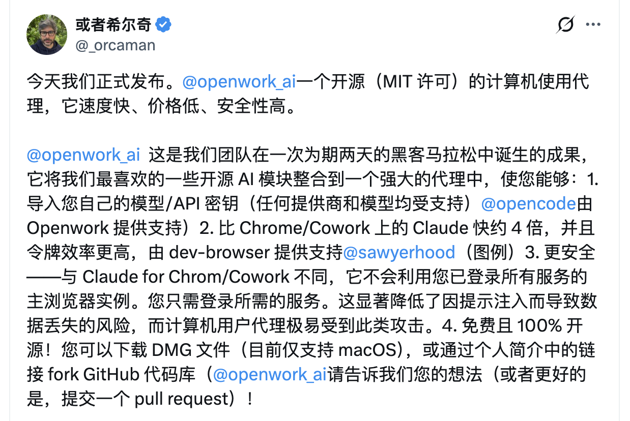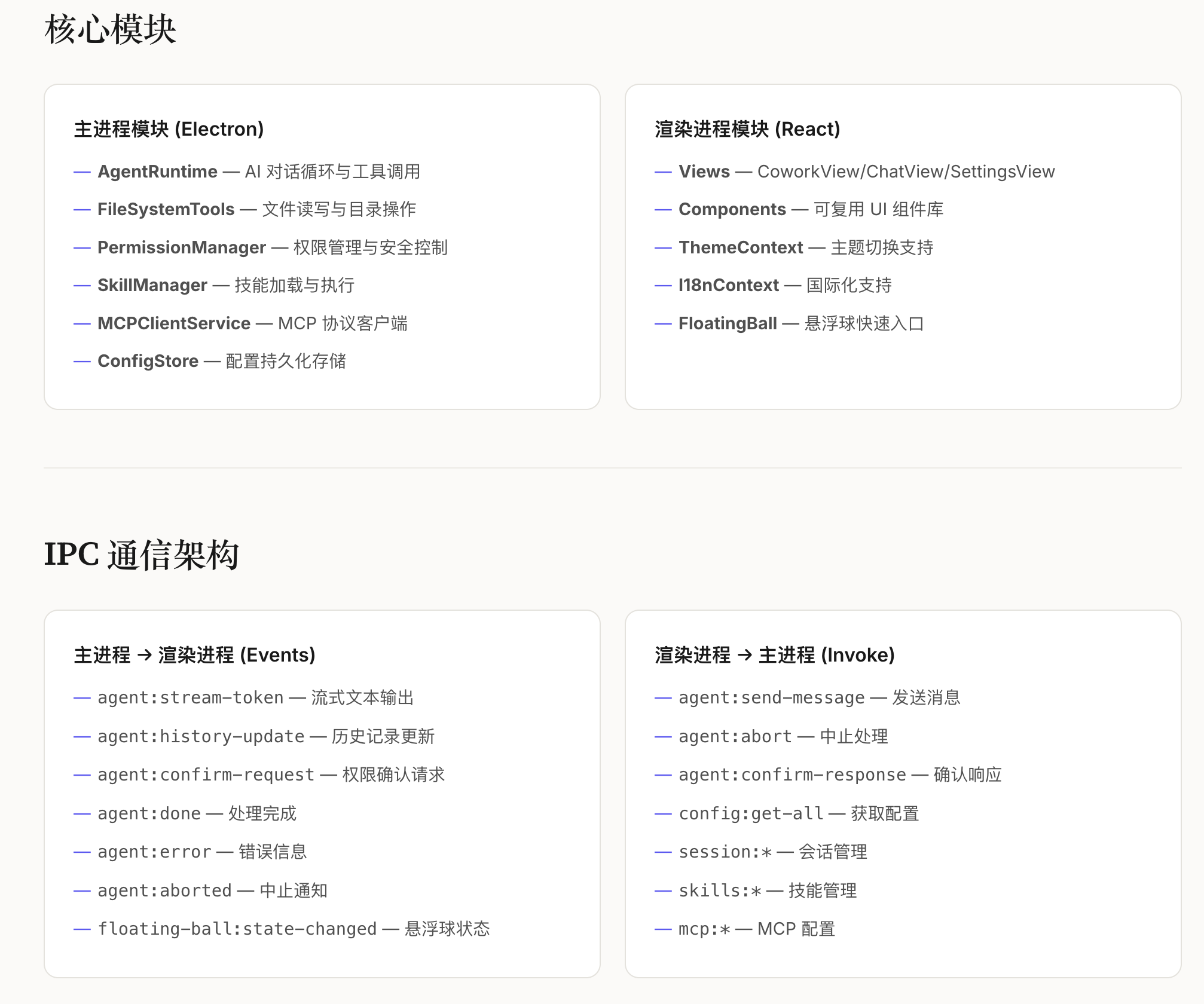 看起来好像cowork只是manus,或者豆包或者扣子,弄了一个桌面客户端。实际上它应该是继续迈向未来的一个个人的,数据安全的ai助理的终极目标的前进的又一步。畅想一下,你的电脑上有一个本地的agent软件,它能记录你的信息和偏好(贾维斯低配版),你可以选择使用端侧模型,像48gb的mac安个32b的模型,也可以选择连接web api。如果你是一个办公室文员,可以要你的ai助手给你每天自动整理报告,自动进行处理。如果你是一个up主,可以要你的ai助手每天自动搜集最新信息,帮你自动发送小红书帖子,帮你自动剪辑b站视频。现在的自动化在不断的加快,是用户心智不断培养的一个过程,普通用户对ai的快速变更可能已经有所疲劳了,但是toc的产品应该还在等待下一个deepseek时刻。
