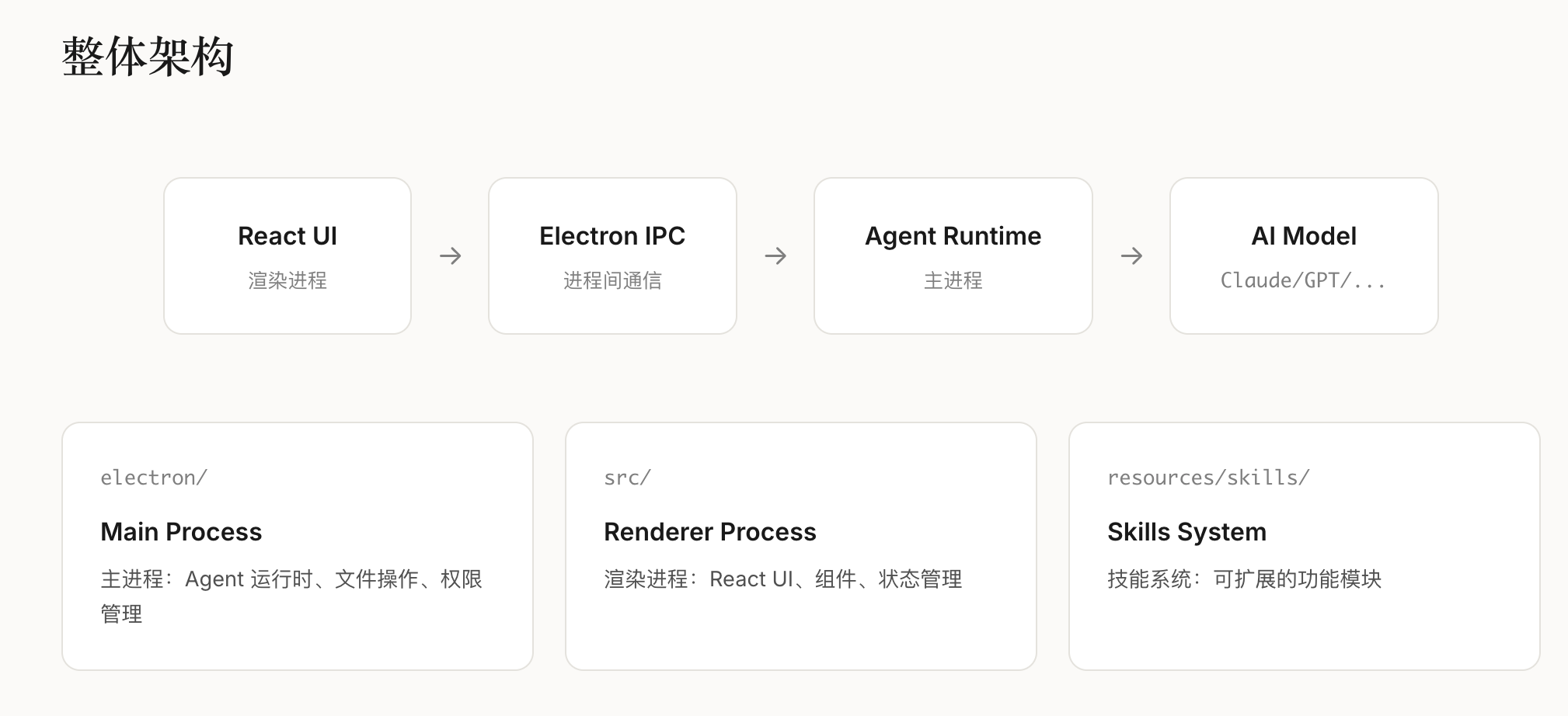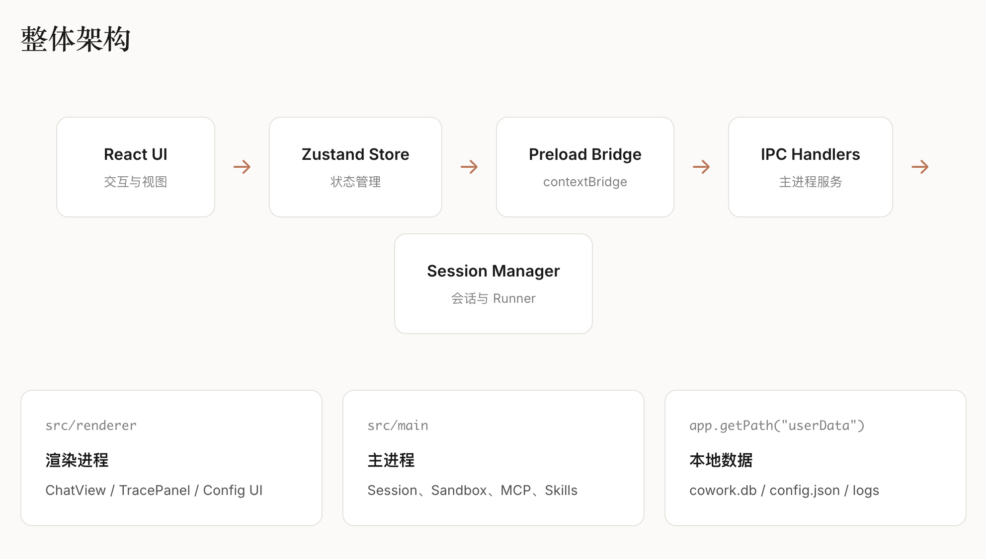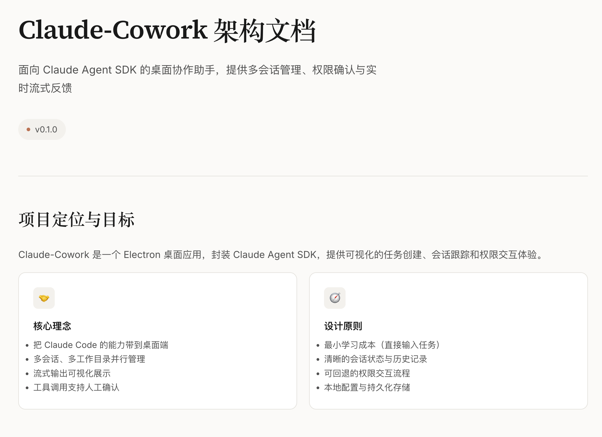 思考:anthropic总是能想出新的东西,比之前openai出智能体商店啥的强多了。从mcp到claude code到skill,再到cowork。因为cowork是闭源的,然后现在AI开发很强了,开源开发者一下就跟进了开源的cowork项目,ai办公助手,像豆包电脑端,还是得上传文件,然后没有特别针对办公场景。现在的cowork实际上就是claude code UI化,然后加强办公方面的能力,产品上的区别我觉得就有点像vibe chat的vscode,但是用户完全不用关心代码,只需要指定目录,这在文件管理上是一种很大提升。豆包那种上传文件,然后生成产出文件就有点落后了。