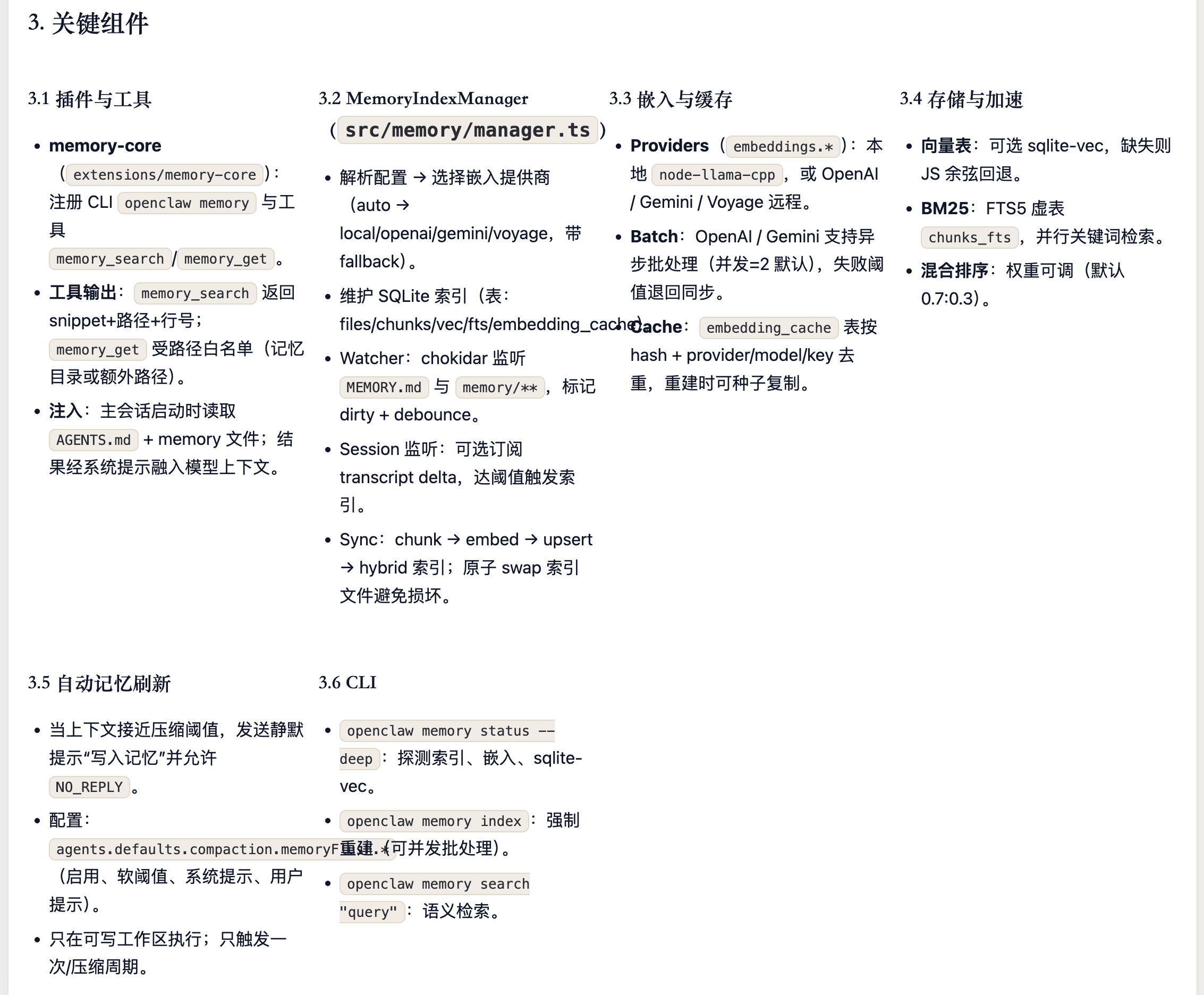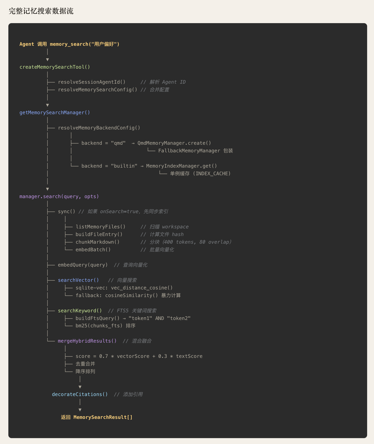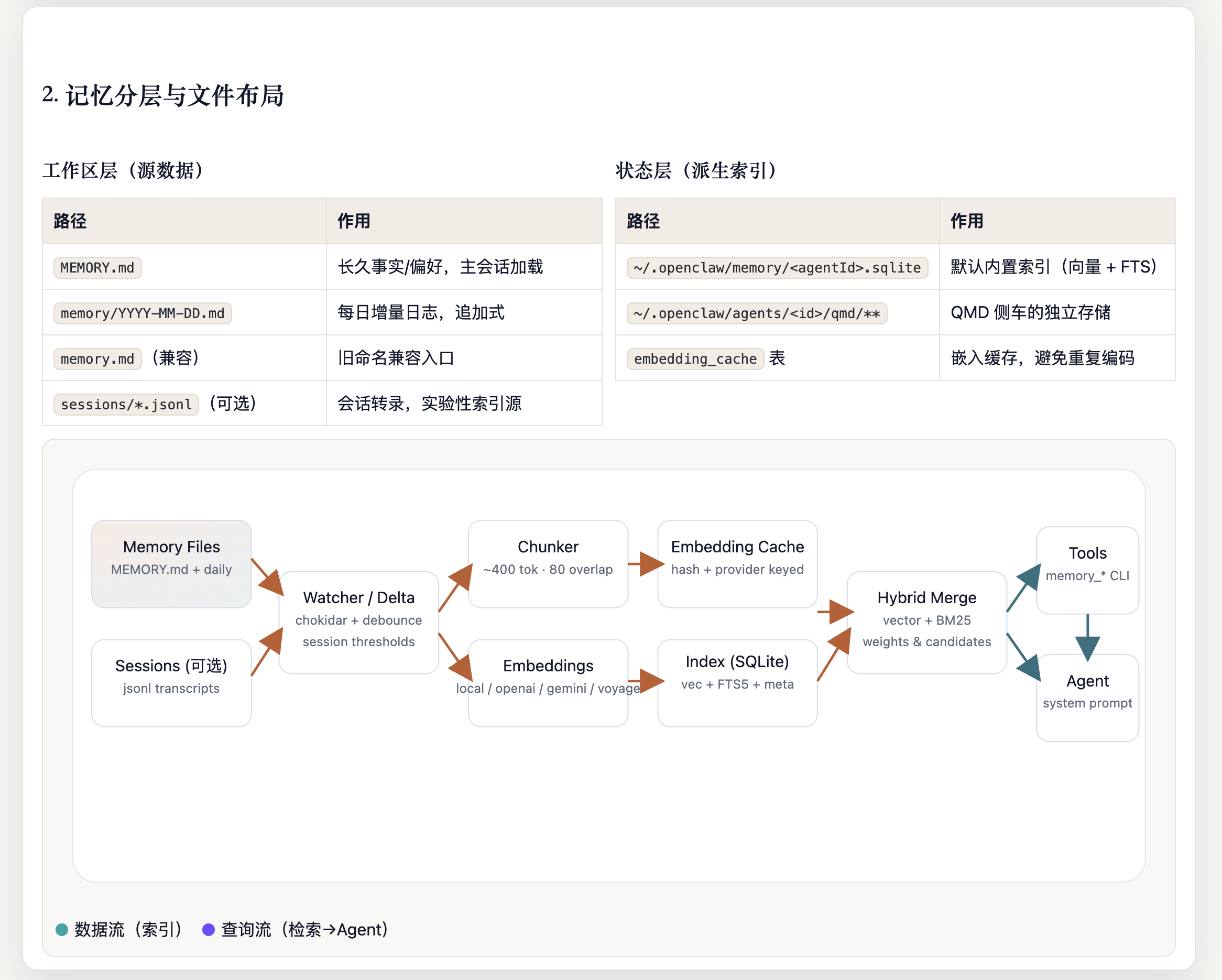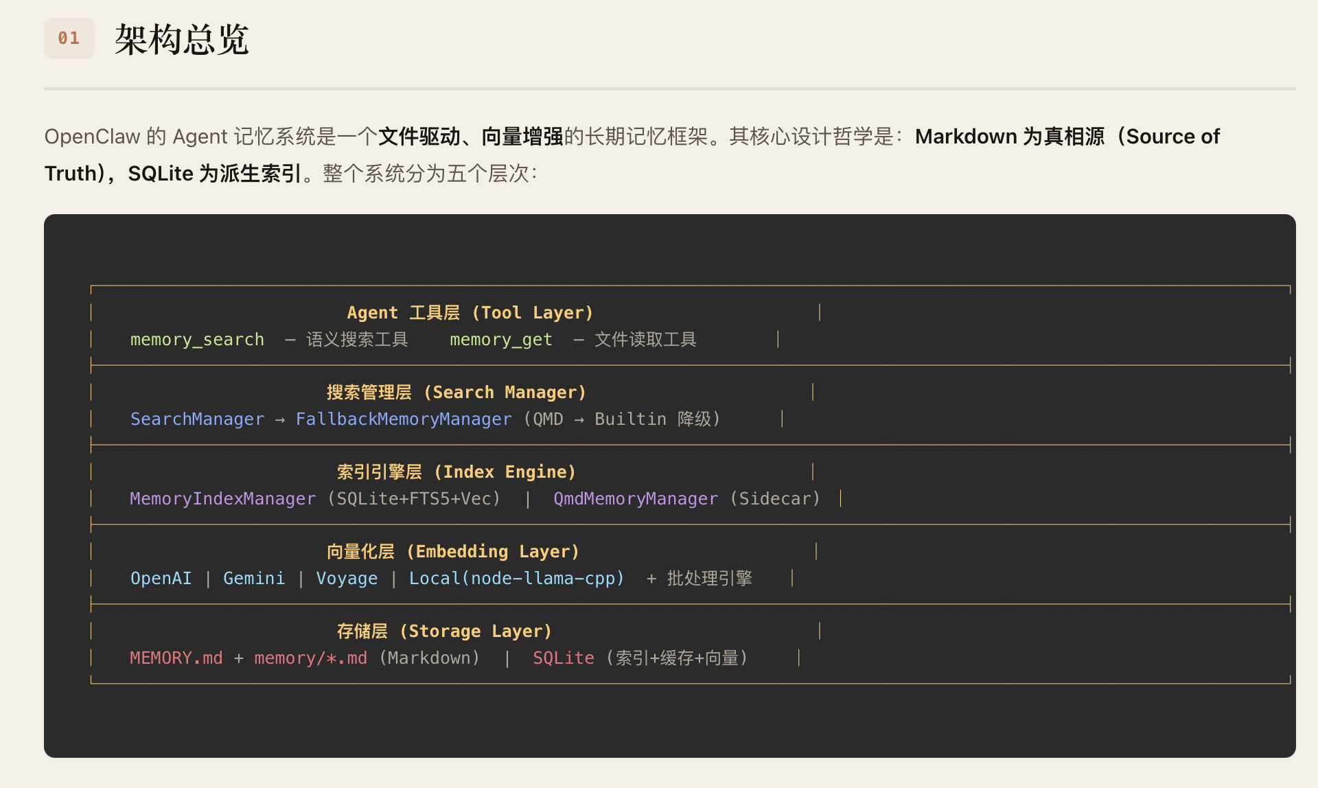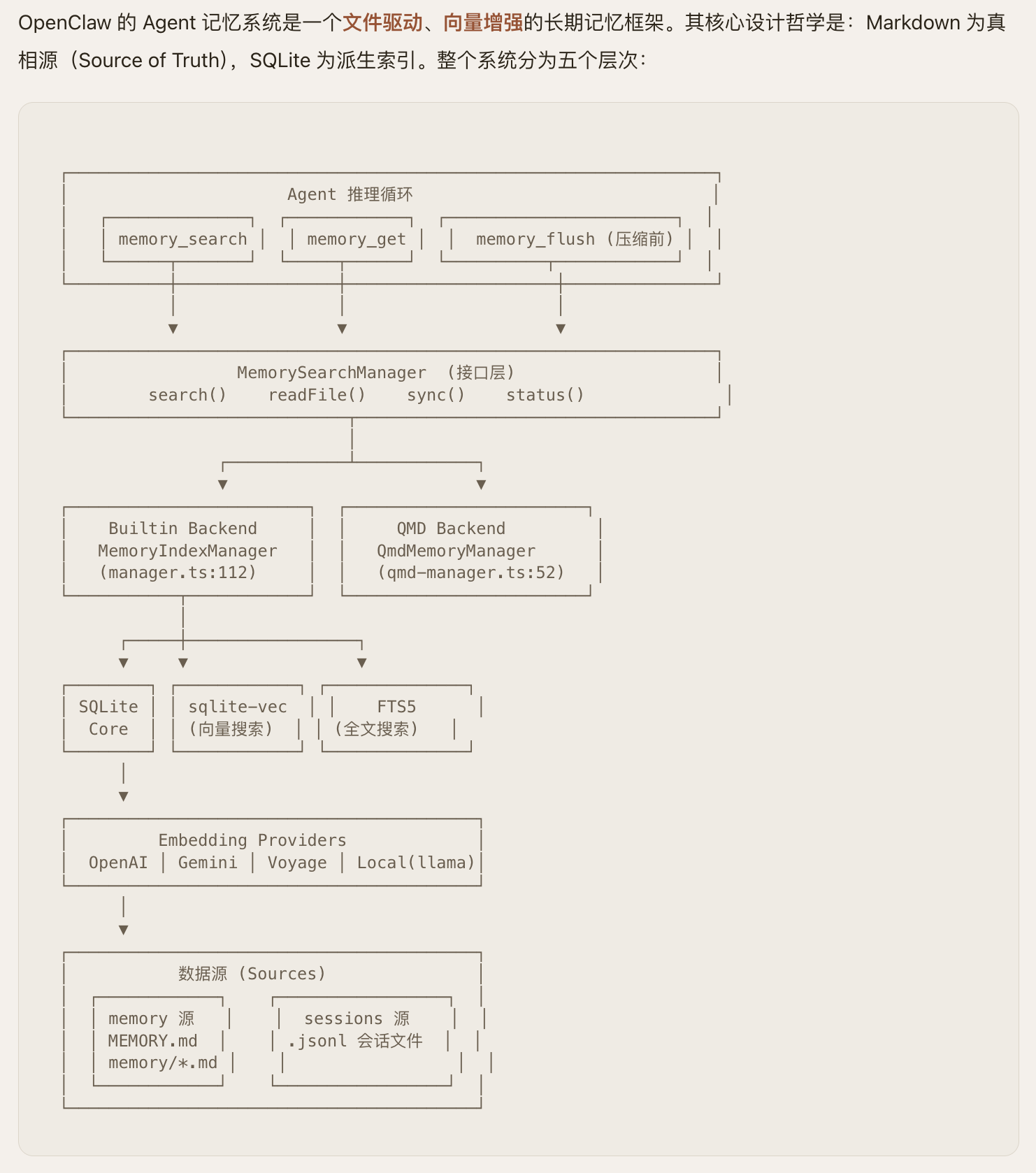 OpenClaw 的 Agent 记忆系统采用"Markdown 为真相源、SQLite为派生索引"的双层存储架构。记忆以人类可读的 Markdown 文件持久化(MEMORY.md +memory/*.md),SQLite 数据库承载 FTS5 全文索引和 sqlite-vec向量索引,支持随时从源文件重建。检索层实现了 BM25关键词搜索与向量语义搜索的混合融合(默认权重 0.7/0.3),向量化支持OpenAI、Gemini、Voyage、本地模型四种 Provider并具备自动选择与降级能力。系统通过三种机制保障记忆持久性:Agent主动写入、会话压缩前的 Memory Flush 自动刷写、以及 /new 命令触发的 SessionMemory Hook。整体架构分为存储层、向量化层、索引引擎层、搜索管理层和 Agent工具层五个层次,各层均内置降级链,确保任意组件失败时系统仍能优雅运行。