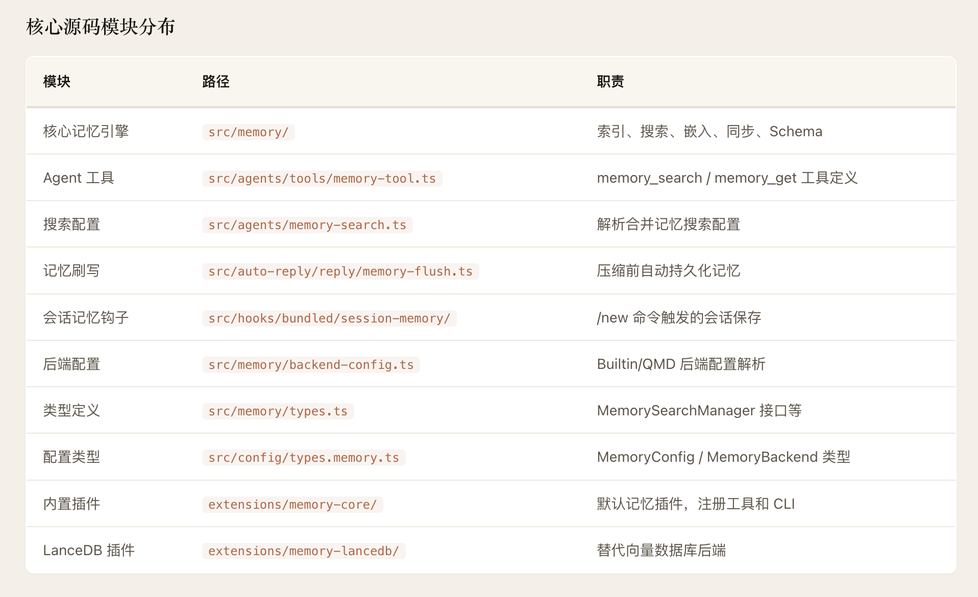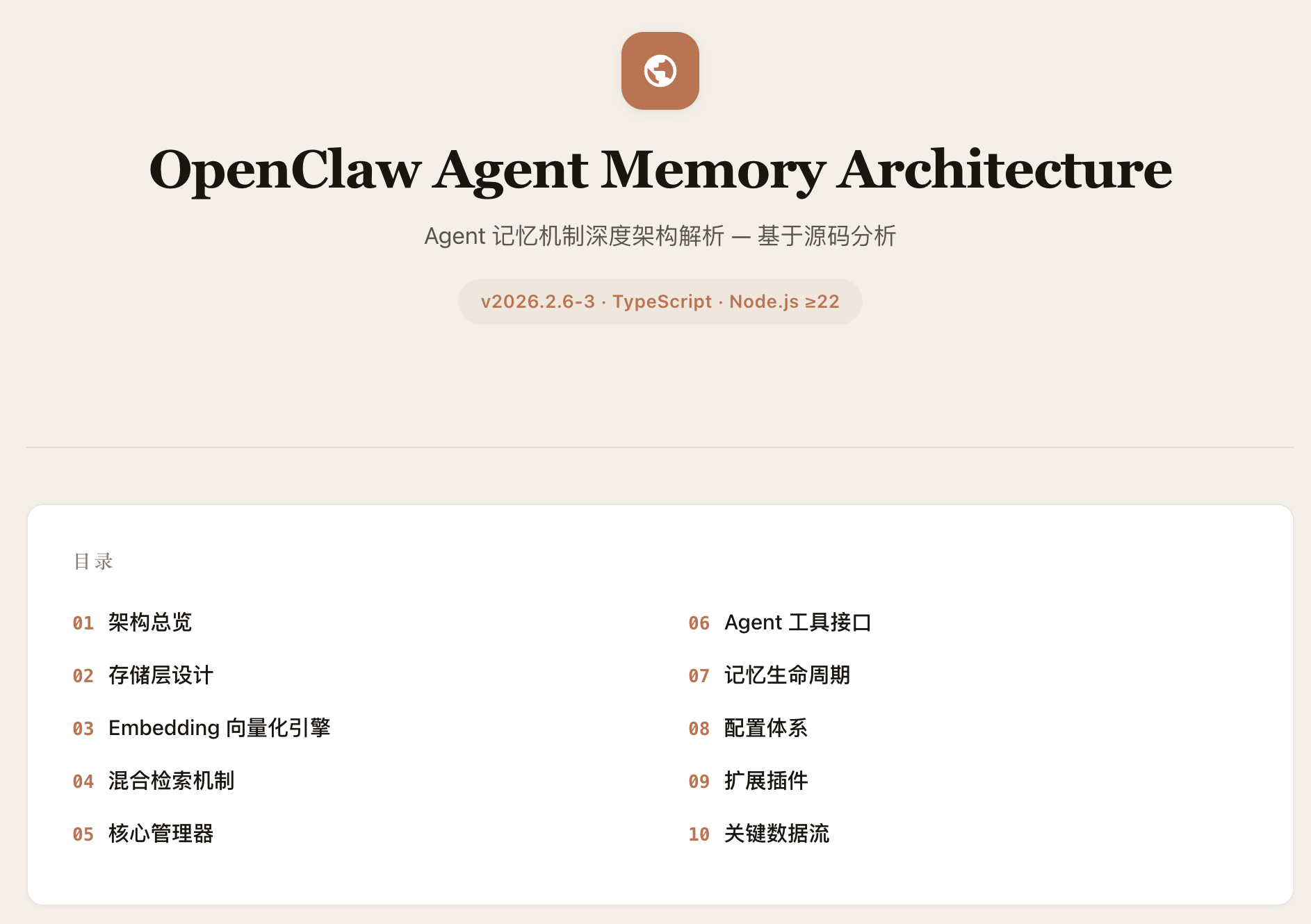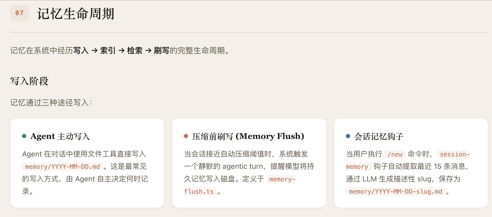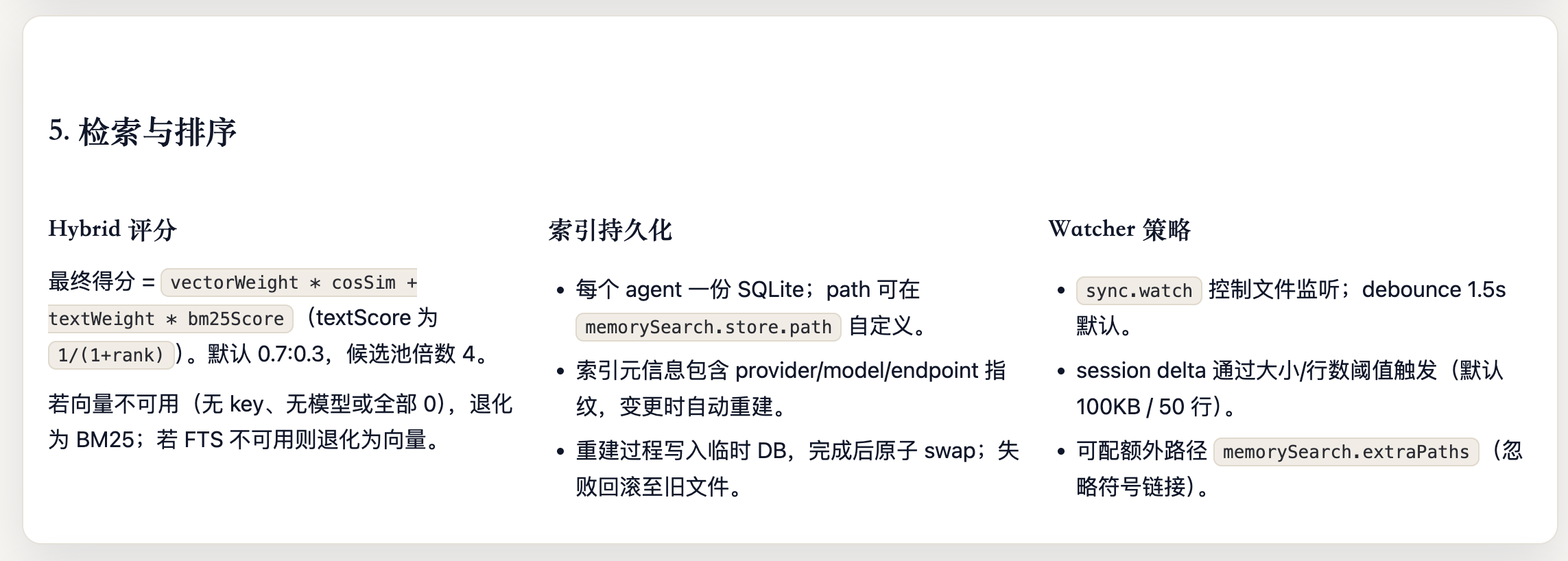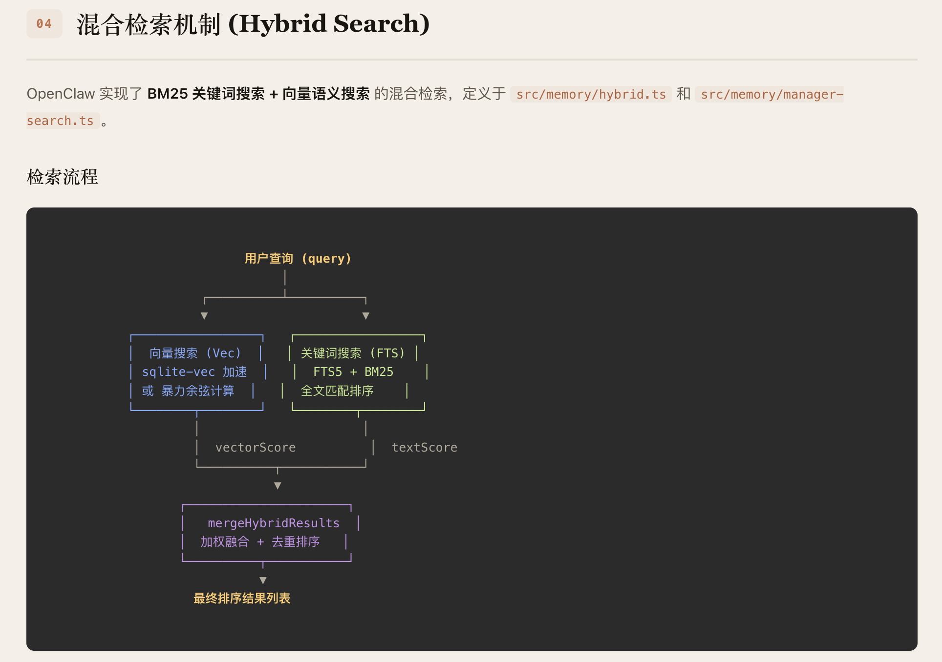 OpenClaw 的 Agent 记忆系统采用"Markdown 为真相源、SQLite为派生索引"的双层存储架构。记忆以人类可读的 Markdown 文件持久化(MEMORY.md +memory/*.md),SQLite 数据库承载 FTS5 全文索引和 sqlite-vec向量索引,支持随时从源文件重建。检索层实现了 BM25关键词搜索与向量语义搜索的混合融合(默认权重 0.7/0.3),向量化支持OpenAI、Gemini、Voyage、本地模型四种 Provider并具备自动选择与降级能力。系统通过三种机制保障记忆持久性:Agent主动写入、会话压缩前的 Memory Flush 自动刷写、以及 /new 命令触发的 SessionMemory Hook。整体架构分为存储层、向量化层、索引引擎层、搜索管理层和 Agent工具层五个层次,各层均内置降级链,确保任意组件失败时系统仍能优雅运行。