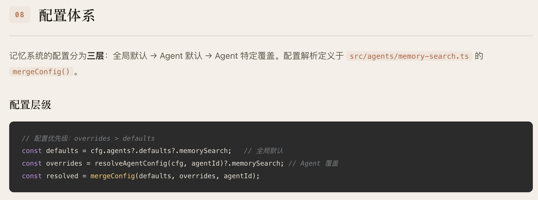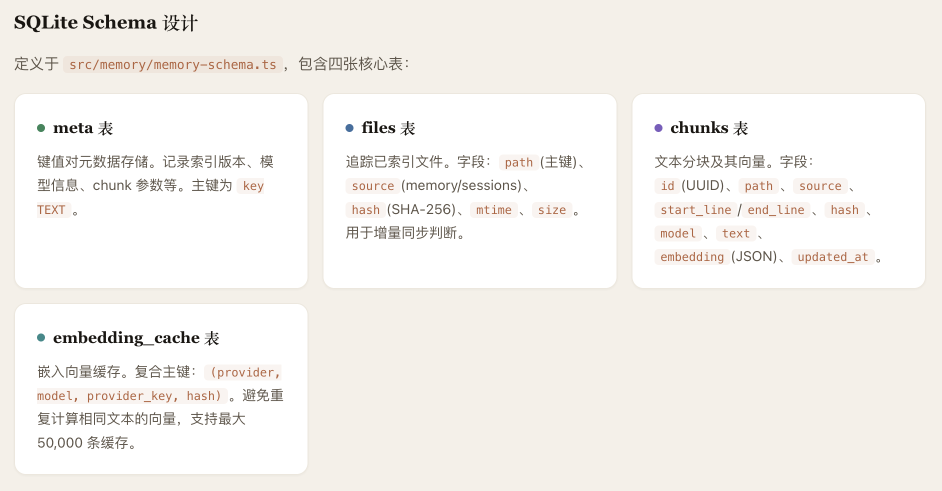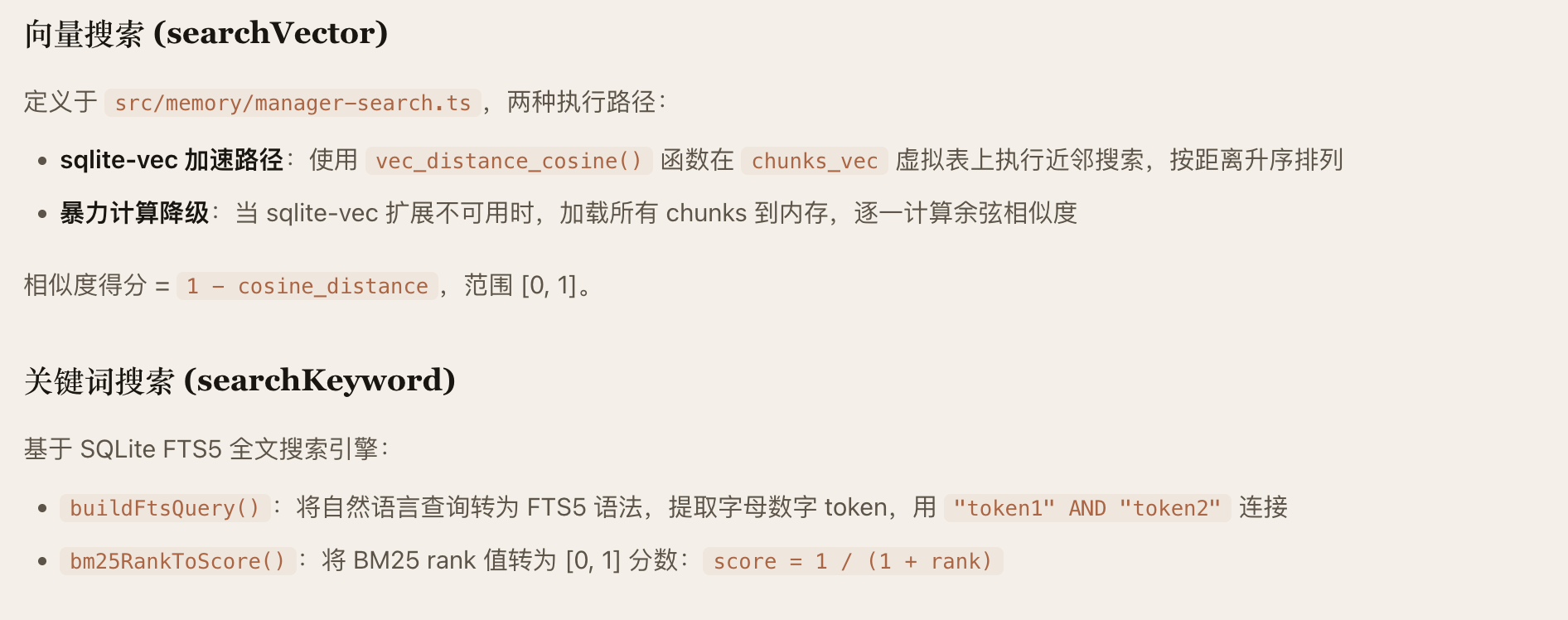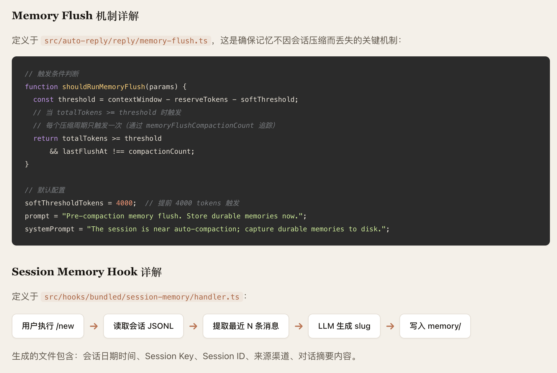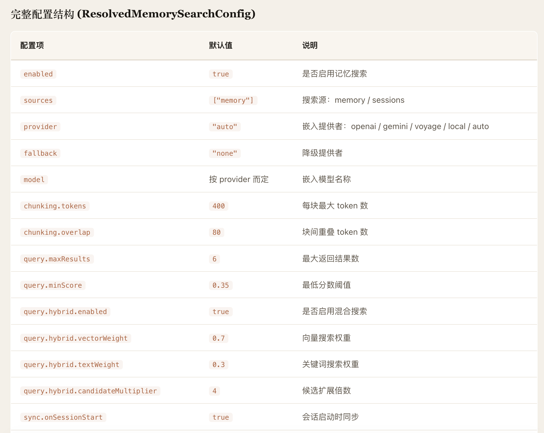 OpenClaw 的 Agent 记忆系统采用"Markdown 为真相源、SQLite为派生索引"的双层存储架构。记忆以人类可读的 Markdown 文件持久化(MEMORY.md +memory/*.md),SQLite 数据库承载 FTS5 全文索引和 sqlite-vec向量索引,支持随时从源文件重建。检索层实现了 BM25关键词搜索与向量语义搜索的混合融合(默认权重 0.7/0.3),向量化支持OpenAI、Gemini、Voyage、本地模型四种 Provider并具备自动选择与降级能力。系统通过三种机制保障记忆持久性:Agent主动写入、会话压缩前的 Memory Flush 自动刷写、以及 /new 命令触发的 SessionMemory Hook。整体架构分为存储层、向量化层、索引引擎层、搜索管理层和 Agent工具层五个层次,各层均内置降级链,确保任意组件失败时系统仍能优雅运行。